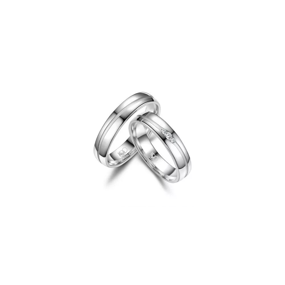 Alianzas en plata de primera ley rodiadas, en mate y brillo y circonita en el modelo de señora.