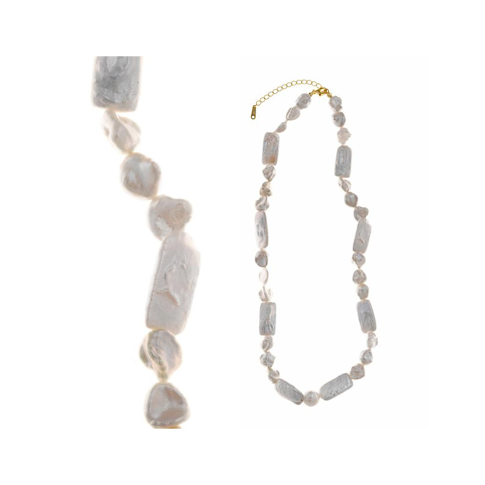 Collar de perlas barrocas, con cierre de plata de primera ley chapado en oro de 18 kilates, y un largo entre 40 y 45cm.