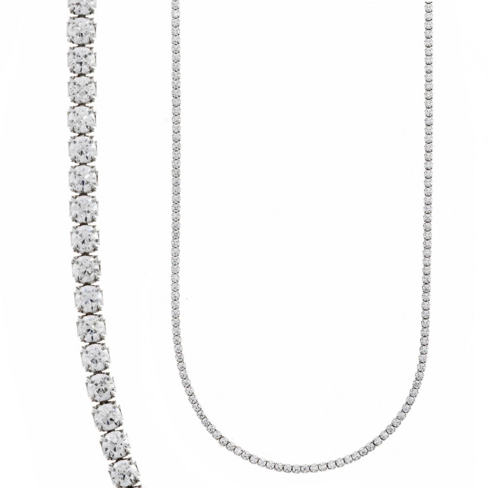 Gargantilla en plata de primera ley rodiada, con circonitas blancas, cierre de mosquetón y un largo entre 40 y 45 cm.