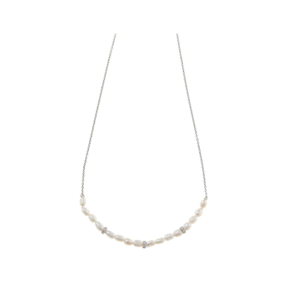 Gargantilla en plata de primera ley rodiada, con circonitas blancas y perlas de rio, cierre de reasa y un largo entre 40 y 45 cm.