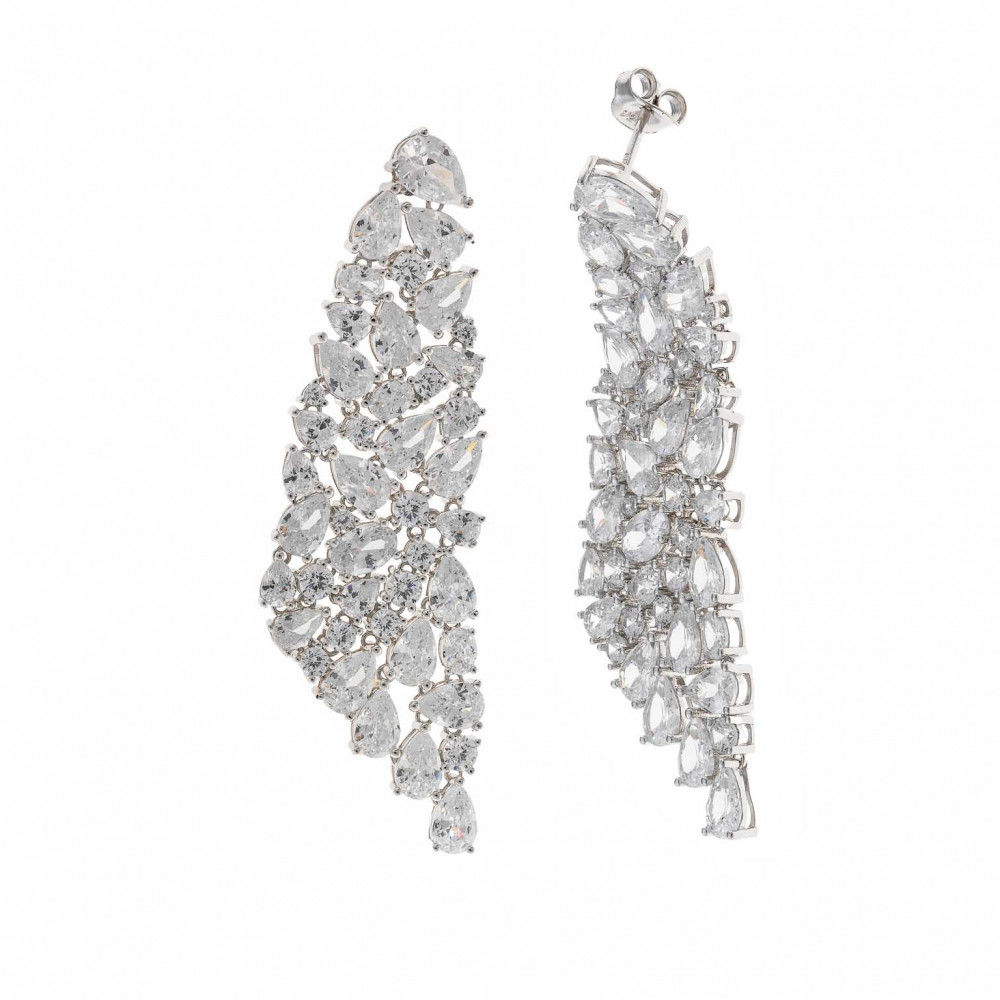 Pendientes en plata de primera ley rodiada con circonitas blancas, un largo de 6 cm y cierres de presion.