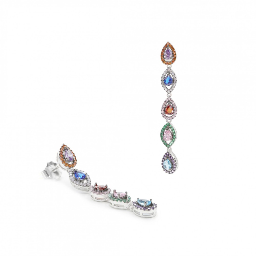 Pendientes de plata de primera ley rodiados, con circonitas de colores en forma de lágrima, cierres de presión y un largo de 4cm.