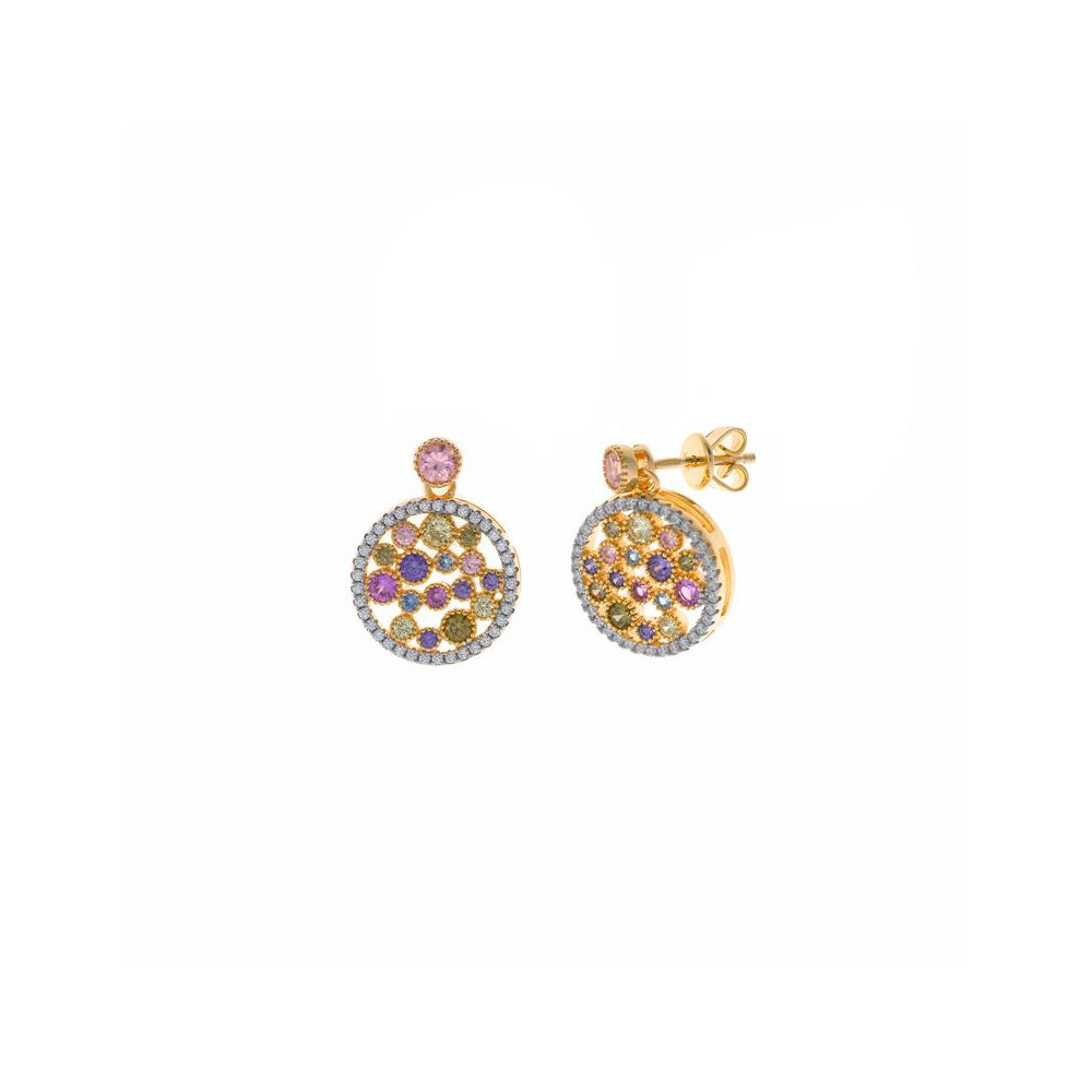 Pendientes en plata de primera ley bañados en oro de 18 kilates, con circonitas de colores y cierres de presión.