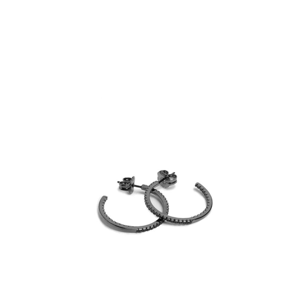 Aros de plata de primera ley galvanizada con circonitas negras, un diámetro de 2.5cm y cierres de presión.